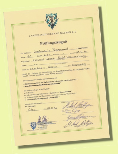 Pepper hat es jetzt schriftlich. Sie ist ein brauchbarer Jagdhund. Sie ist allgemein brauchbar zur Nachsuche auf Niederwild und Schalenwild.